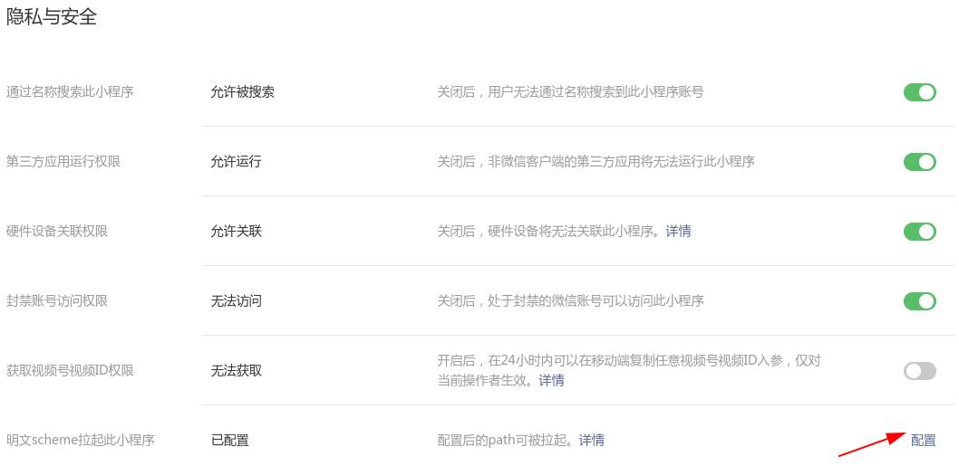 然后在小程序,账号设置,明文scheme拉起小程序,点配置。