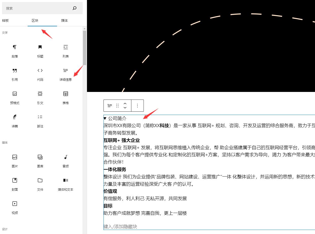 然后到中间加一个区块,搞一些公司介绍什么的就可以了。